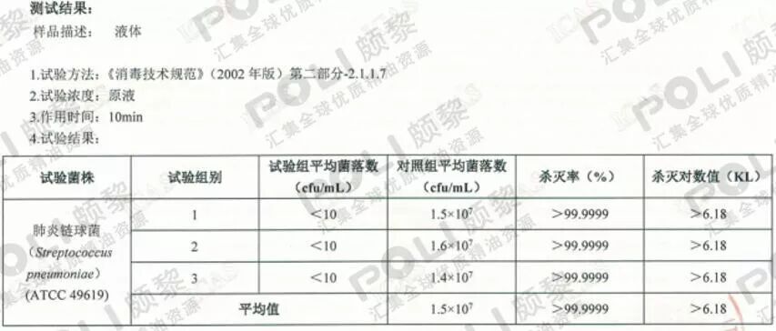 能够在2分钟内,杀死99.94%的金黄色葡萄球菌ATCC6538、99.92%的铜绿假单胞菌ATCC9027,以及99.99%的肺炎链球菌ATCC49619。